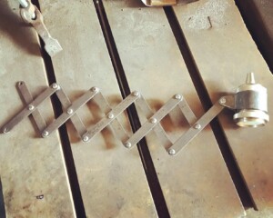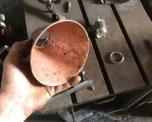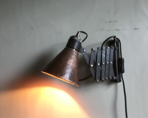 Aufbauend auf einer fertigen Lampen-Fassung sind die Schere, die Aufhängungen und der Lampenschirm angefertigt worden. Die brünierten Stahlelemente und das gehämmerte Kupfer des Lampenschirms verleihen der Lampe eine besondere Optik. Der Kupferschirm sorgt außerdem für ein ausgesprochen warmes, angenehmes Licht.