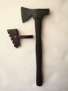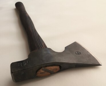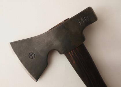 Das Beil wurde mit den Initialien des neuen Besitzers gestempelt und bekam noch ein schützende Lederhülle. Der Stiel wurde im Feuer geschwärzt.
